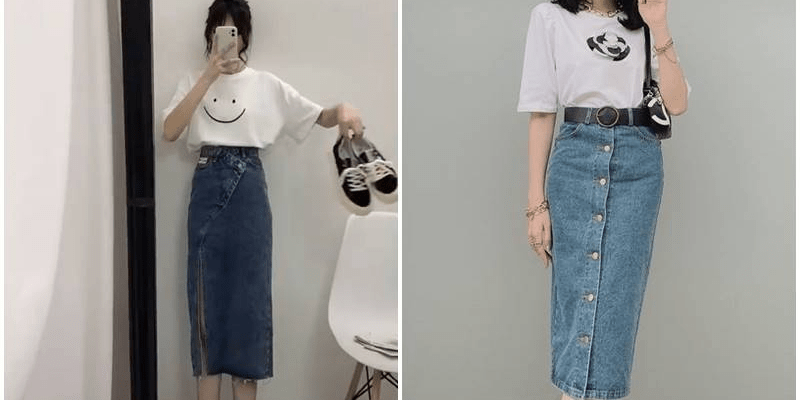 Cách phối chân váy jean dài cho người mập với chân váy jean + áo phông trơn